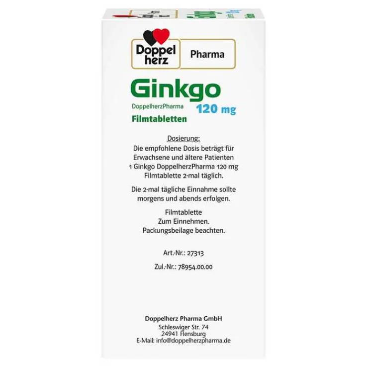 Doppelherz Ginkgo 120 mg Filmtabletten. Für Erwachsene. Wirkstoff: Ginkgo-biloba-Blätter Trockenextrakt. Anwendungsgebiete: Pflanzliches Arzneimittel zur Verbesserung einer altersbedingten kognitiven Beeinträchtigung und der Lebensqualität bei leichter Demenz. Warnhinweise: Enthält Lactose und Glucose. Zu Risiken und Nebenwirkungen lesen Sie die Packungsbeilage und fragen Sie Ihre Ärztin, Ihren Arzt oder in Ihrer Apotheke. Stand 12/2022