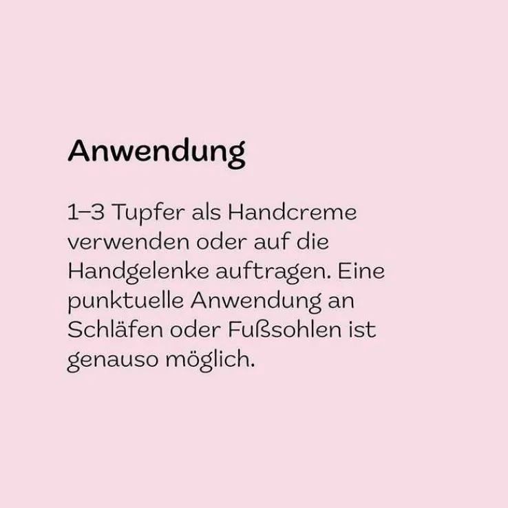 Tipp: 1–3 Tupfer als Handcreme verwenden oder auf die Handgelenke auftragen. Eine punktuelle Anwendung an Schläfen oder Fußsohlen ist genauso möglich.