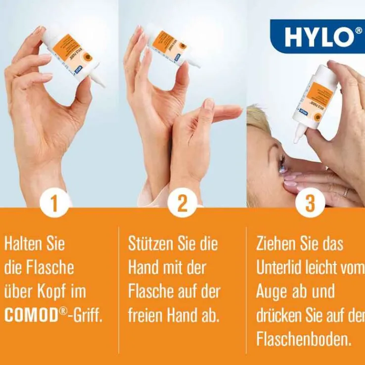 Neigen Sie den Kopf leicht nach hinten und ziehen mit der anderen Hand das untere Augenlid leicht herab. Üben Sie kräftigen Druck auf den Flaschenboden aus und träufeln den Tropfen in den Bindehautsack. Dank des speziellen COMOD® Pumpsystems tritt genau 1 Tropfen aus. Schließen Sie das Auge langsam, um die Flüssigkeit auf der Augenoberfläche zu verteilen. Nach Gebrauch die Tropferspitze sofort mit der Kappe verschließen.