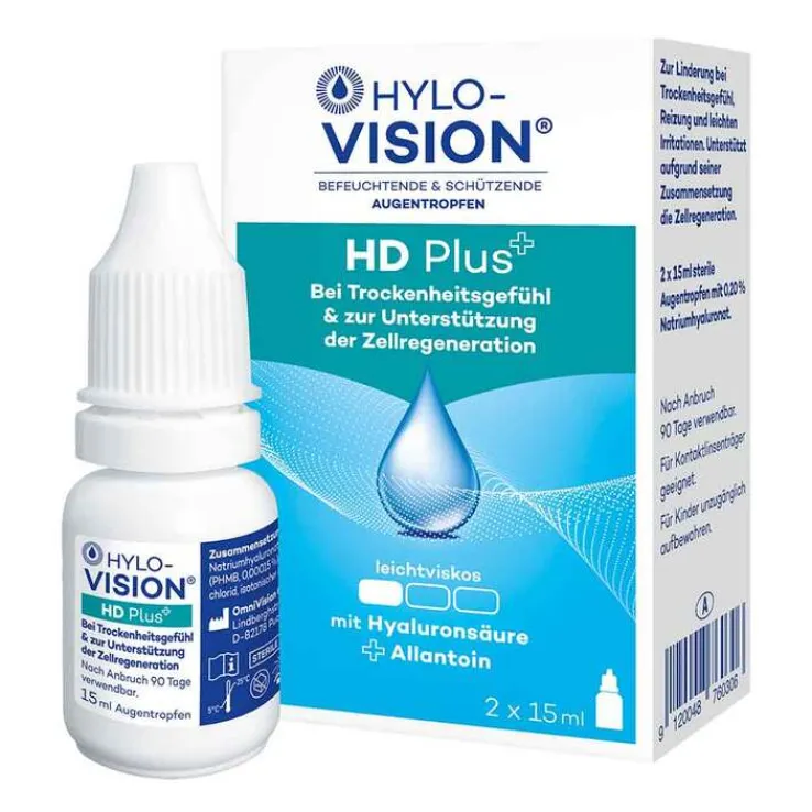 Als Tränenersatzmittel haben sich Augentropfen mit Hyaluronsäure bewährt. HYLO-VISION®HD Plus enthält zusätzlich Allantoin und eignet sich sehr gut zur wohltuenden Linderung bei Trockenheitsgefühl, Reizungen und leichten Irritationen. Die leichtviskose Lösung ist gut verträglich und verteilt sich leicht auf der Augenoberfläche. HYLO-VISION® HD Plus Augentropfen sind auch zur Benetzung von harten und weichen Kontaktlinsen geeignet. HYLO-VISION® HD Plus Augentropfen