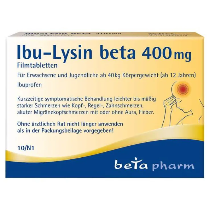Ibu-Lysin beta 400 mg Filmtabletten. Wirkstoff: Ibuprofen. Anw.: Bei Erwachsenen und Jugendlichen ab 40 kg Körpergewicht (ab 12 Jahren): Kurzzeitige symptomatische Behandlung von leichten bis mäßig starken Schmerzen wie Kopfschmerzen, Regelschmerzen, Zahnschmerzen, akuten Migränekopfschmerzen mit oder ohne Aura, Fieber. Warnh.: Ohne ärztlichen Rat nicht länger anwenden als in der Packungsbeilage vorgegeben! Zu Risiken und Nebenwirkungen lesen Sie die Packungsbeilage und fragen Sie Ihre Ärztin, Ihren Arzt oder in Ihrer Apotheke. betapharm Arzneimittel GmbH, 86156 Augsburg www.betapharm.de
