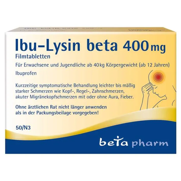 Ibu-Lysin beta 400 mg Filmtabletten. Wirkstoff: Ibuprofen. Anw.: Bei Erwachsenen und Jugendlichen ab 40 kg Körpergewicht (ab 12 Jahren): Kurzzeitige symptomatische Behandlung von leichten bis mäßig starken Schmerzen wie Kopfschmerzen, Regelschmerzen, Zahnschmerzen, akuten Migränekopfschmerzen mit oder ohne Aura, Fieber. Warnh.: Ohne ärztlichen Rat nicht länger anwenden als in der Packungsbeilage vorgegeben! Zu Risiken und Nebenwirkungen lesen Sie die Packungsbeilage und fragen Sie Ihre Ärztin, Ihren Arzt oder in Ihrer Apotheke. betapharm Arzneimittel GmbH, 86156 Augsburg www.betapharm.de