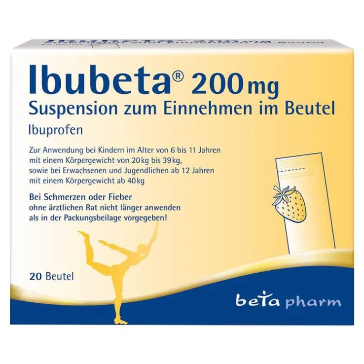 Ibubeta® 200 mg Suspension ist speziell für Kinder ab 6 Jahren und 20 kg entwickelt worden. Die Suspension bietet eine praktische, einzeldosierte und altersgerechte Lösung; ideal für jede Haus- und Reiseapotheke mit Kindern. Da viele Kinder Schwierigkeiten haben, Tabletten zu schlucken, stellt Ibubeta® 200 mg Suspension zum Einnehmen im Beutel eine hervorragende Alternative dar.