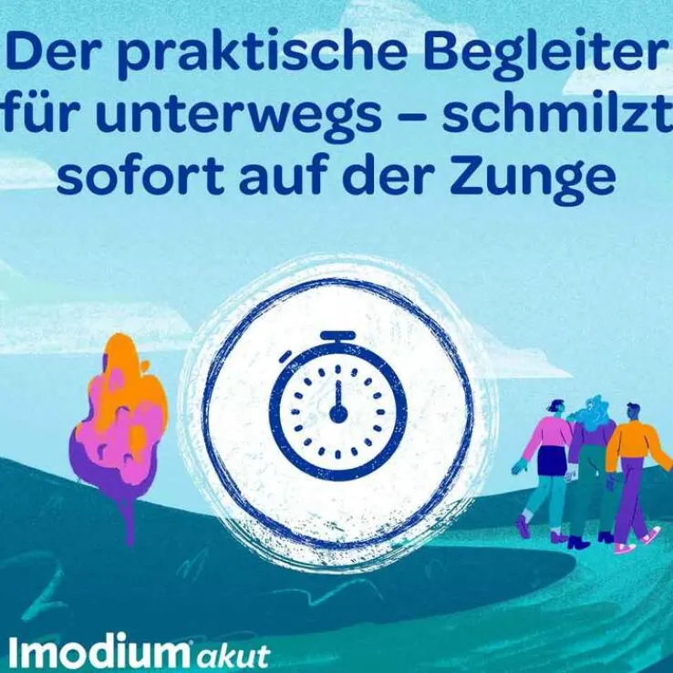 Imodium® akut lingual Wirkstoff: Loperamidhydrochlorid. Anwendungsgebiete: Symptomatische Behandlung von akuten Durchfällen für Erwachsene und Jugendliche ab 12 Jahren, sofern keine ursächliche Therapie zur Verfügung steht. Eine über 2 Tage hinausgehende Behandlung nur unter ärztlicher Verordnung und Verlaufsbeobachtung. Warnhinweise: Enthält Aspartam, Pfefferminz-Aroma (Benzylalkohol, Levomenthol, Glukose und Spuren von Sulfiten). Zu Risiken und Nebenwirkungen lesen Sie die Packungsbeilage und fragen Sie Ihre Ärztin, Ihren Arzt oder in Ihrer Apotheke. Kenvue Germany GmbH, 41470 Neuss. Stand: 05/2025