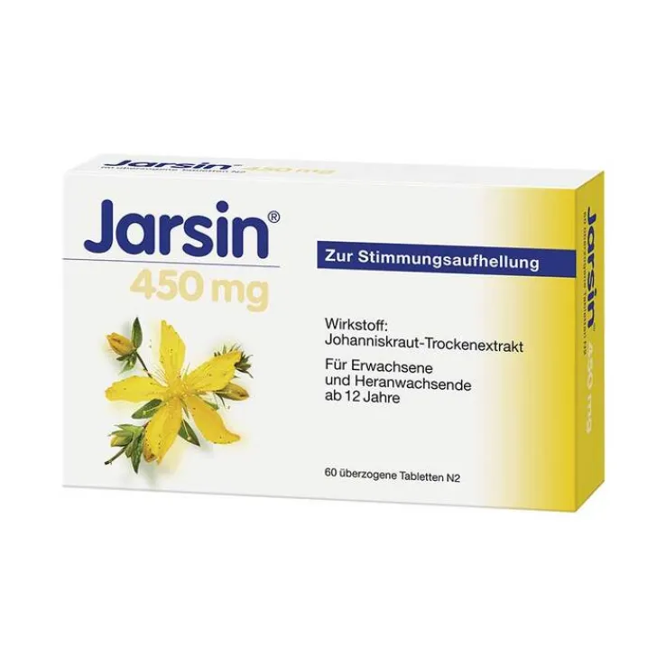Jarsin® 450 mg. Wirkstoff: Johanniskraut-Trockenextrakt. Anwendungsgebiete: Pflanzliches Arzneimittel zur Behandlung leichter depressiver Episoden. Zu Risiken und Nebenwirkungen lesen Sie die Packungsbeilage und fragen Sie Ihre Ärztin, Ihren Arzt oder in Ihrer Apotheke.