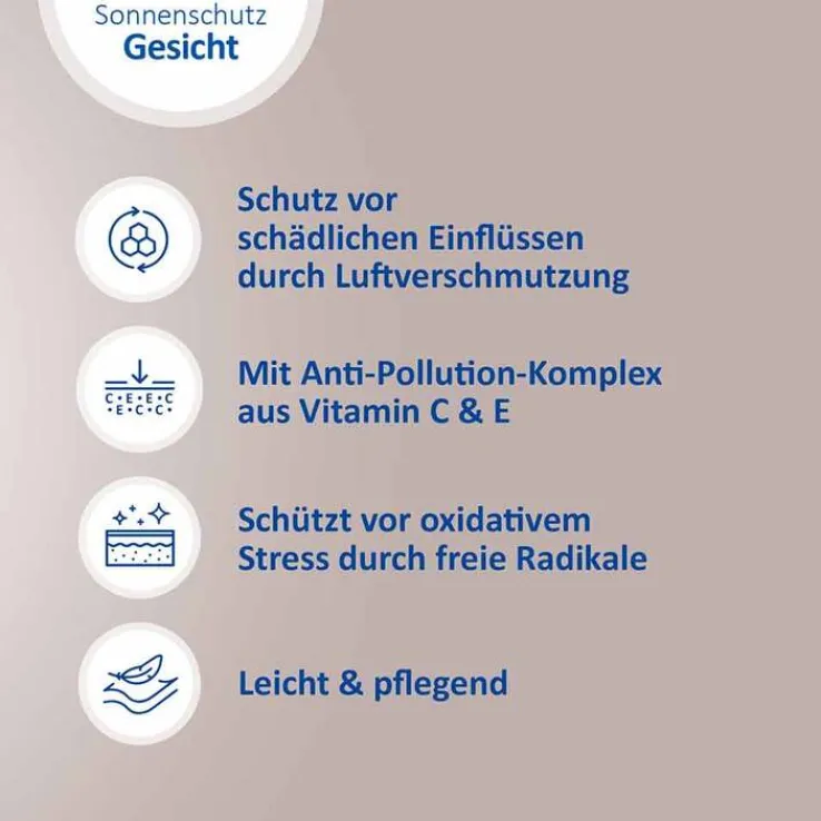 Dank ihrer leichten und pflegenden Rezeptur zieht die Sonnenschutz-Creme schnell ein und bietet eine ideale Grundlage für Make-Up. Sie schützt Ihre Haut effektiv vor sonnenbedingten Zellschäden und dank Anti-Pollution-Komplex aus Vitamin C & E vor oxidativem Stress und freien Radikalen.