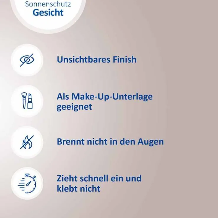 Tragen Sie die Sonnenschutz-Creme großzügig auf das Gesicht, den Hals, das Dekollete und die Hände auf. Vor dem Auftrag von Make-Up oder anderen Gesichtsprodukten gut einziehen lassen. Cremen Sie nach Bedarf nach – vor allem nach dem Baden oder Schwitzen.