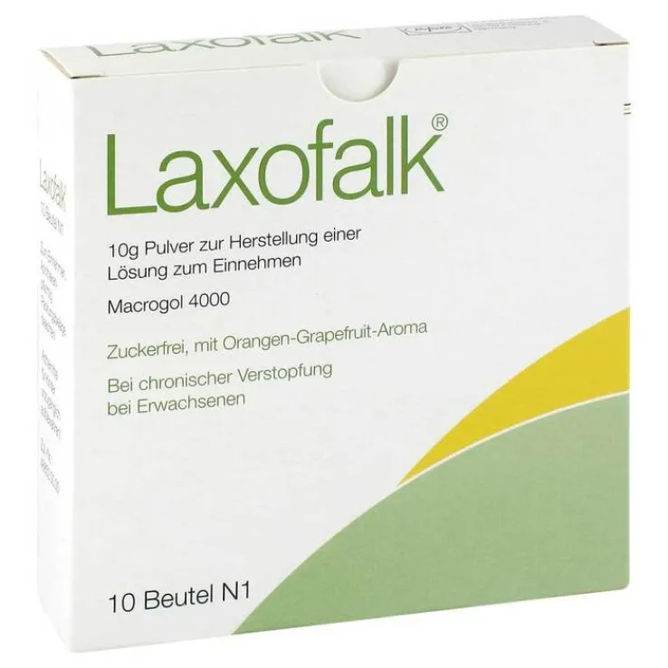 Der Wirkstoff in Laxofalk® ist Macrogol 4000, ein Polyethylenglycol. Macrogol 4000 bindet Wasser und trägt es an den Ort der Verstopfung. Der harte Stuhl wird aufgeweicht und geschmeidiger und das Stuhlvolumen wird vergrößert. Dadurch wird die Stuhlentleerung auf natürliche Weise angeregt.