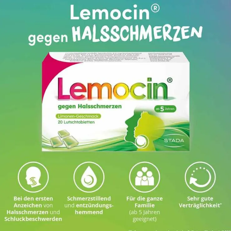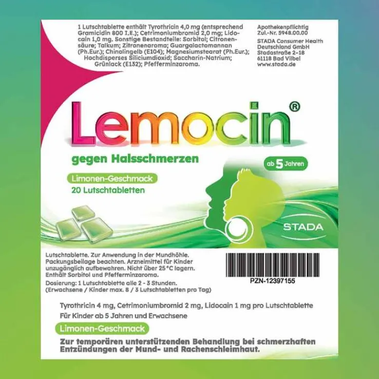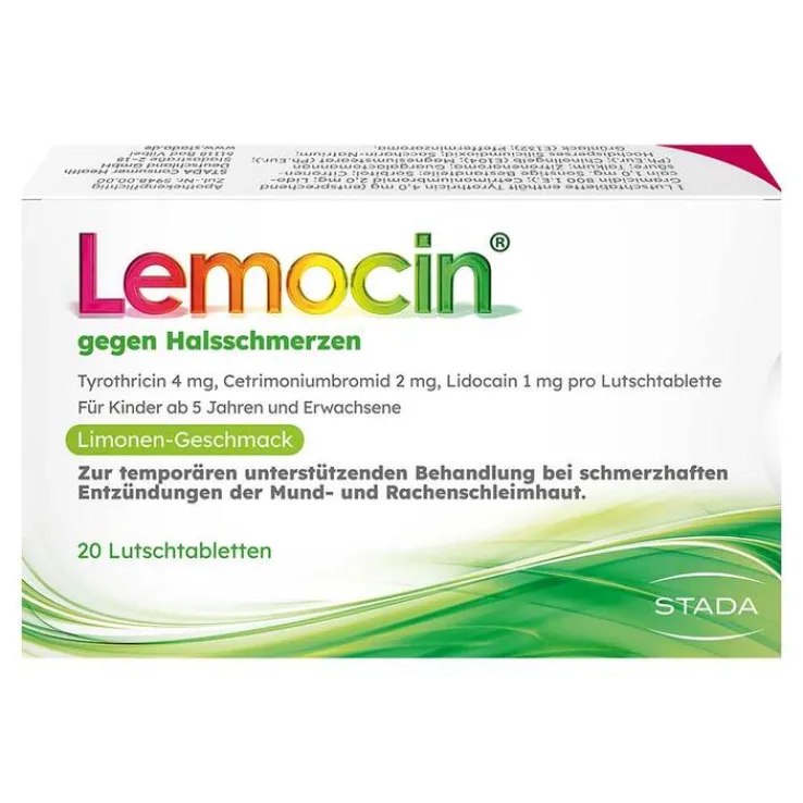 Lemocin® gegen Halsschmerzen.Tyrothricin 4 mg, Cetrimoniumbromid 2 mg, Lidocain 1 mg pro Lutschtablette. Für Kinder ab 5 Jahren und Erwachsene. Wirkstoffe: Tyrothricin, Cetrimoniumbromid, Lidocain. Zur temporären unterstützenden Behandlung bei schmerzhaften Entzündungen der Mund- und Rachenschleimhaut. Wenn Sie sich nach 2 Tagen nicht besser oder gar schlechter fühlen, wenden Sie sich an Ihren Arzt. Hinweis: Enthält Sorbitol und Pfefferminzaroma. Zu Risiken und Nebenwirkungen lesen Sie die Packungsbeilage und fragen Sie Ihre Ärztin, Ihren Arzt oder in Ihrer Apotheke. STADA Consumer Health Deutschland GmbH, Stadastraße 2–18, 61118 Bad Vilbel Stand: Juli 2023