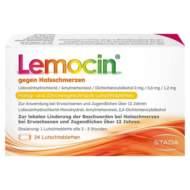 Lemocin® gegen Halsschmerzen Lidocainhydrochlorid / Amylmetacresol / Dichlorbenzylalkohol 2 mg / 0,6 mg / 1,2 mg Honig- und Zitronengeschmack Lutschtabletten. Zur Anwendung bei Erwachsenen und Jugendlichen über 12 Jahren. Wirkstoffe: Lidocainhydrochlorid-Monohydrat, Amylmetacresol, 2,4-Dichlorbenzylalkohol. Wird angewendet zur lokalen Linderung der Beschwerden bei Halsschmerzen. Wenn Sie sich nach 2 Tagen nicht besser oder gar schlechter fühlen, wenden Sie sich an Ihren Arzt. Hinweis: Enthält Gelborange S, Minzöl, Glucose und Saccharose. Zu Risiken und Nebenwirkungen lesen Sie die Packungsbeilage und fragen Sie Ihre Ärztin, Ihren Arzt oder in Ihrer Apotheke. STADA Consumer Health Deutschland GmbH, Stadastraße 2–18, 61118 Bad Vilbel. Stand: November 2022.
