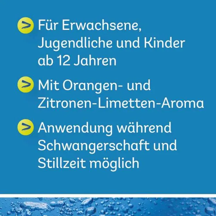Sonstige Bestandteile: Orangen-Aroma (enthält: Geschmacksstoffe, Maltodextrin, arabisches Gummi, all-rac-a-Tocopherol) und Zitronen-Limetten-Aroma (enthält: Geschmacksstoffe, Maltodextrin, Mannitol (Ph.Eur.), D-Glucono-1,5-lacton, Sorbitol (Ph.Eur.), arabisches Gummi, hochdisperses Siliciumdioxid), Saccharin-Natrium (Ph.Eur.), Hochdisperses Siliciumdioxid