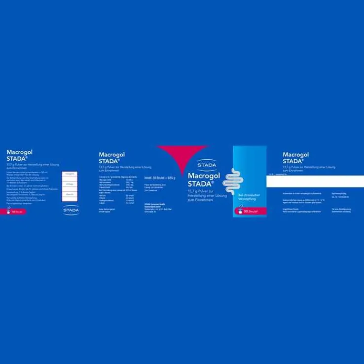 Macrogol STADA® 13,7 g Pulver zur Herstellung einer Lösung zum Einnehmen. Wirkstoffe: Macrogol 3350, Natriumchlorid, Natriumhydrogencarbonat, Kaliumchlorid. Abführmittel zur Behandlung der chronischen Verstopfung bei Erwachsenen, Kindern ab 12 Jahren und älteren Patienten. Es verhilft Ihnen zu einer unproblematischen Darmtätigkeit, selbst wenn Sie bereits über einen langen Zeitraum unter Verstopfung gelitten haben. Es wirkt auch bei einer sehr schlimmen Verstopfung, die als Stuhlverhaltung (komplette schwere Verstopfung) bezeichnet wird. Hinweis: Hoher Natriumgehalt. Enthält Kalium. Bei Kindern unter 12 Jahren nicht empfohlen. Zu Risiken und Nebenwirkungen lesen Sie bitte die Packungsbeilage und fragen Sie Ihren Arzt oder Apotheker. STADA Consumer Health Deutschland GmbH, Stadastraße 2–18, 61118 Bad Vilbel. Stand: November 2022
