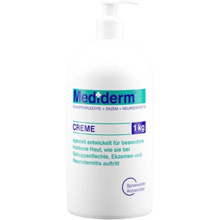Mediderm® Creme wurde speziell entwickelt für besonders trockene Haut, wie sie bei Schuppenflechte, Ekzemen und Neurodermitis auftritt. Die Creme spendet Feuchtigkeit und bildet eine Schutzbarriere, wodurch der Feuchtigkeitsgehalt aufrechterhalten und die Haut vor äußeren Einflüssen geschützt wird. Mediderm® Creme unterstützt die Linderung von Hautirritationen, Brennen und Juckreiz sowie die Aufrechterhaltung eines entspannten Hautgefühls. Die Haut wird beruhigt, glatt und geschmeidig, wodurch bei regelmäßiger Anwendung die Schuppen- und Rissbildung reduziert wird.