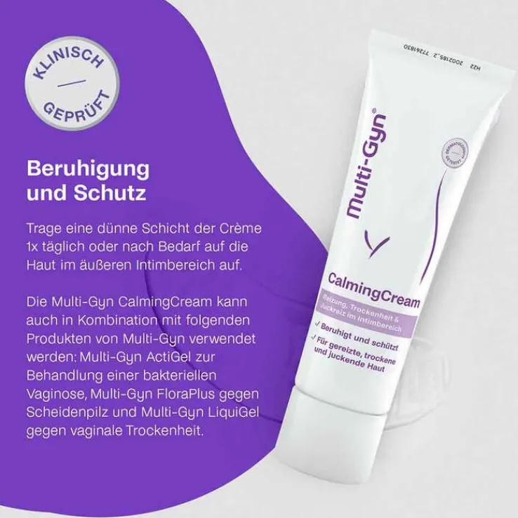 Multi-Gyn CalmingCream ist als tägliche Intimpflege für Damen und zur Linderung äußerer Intimbeschwerden bestimmt. Sie ist eine Creme und dient nicht der Behandlung innerer Intimbeschwerden wie beispielsweise bakteriellen Vaginosen oder Scheidenpilzproblemen.
