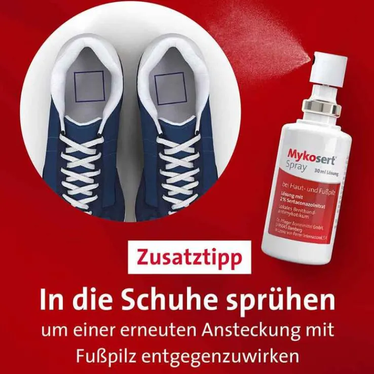Mykosert® Spray kann im Rahmen der Fußpilz-Therapie zusätzlich auch in die Schuhe gesprüht werden und so dazu beitragen, eine erneute Ansteckung mit Fußpilz zu vermindern.