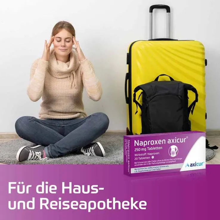 Naproxen axicur® 250 mg Tabletten. Anwendungsgebiete: Schmerzstillendes, fiebersenkendes und entzündungshemmendes Arzneimittel (nicht-steroidales Antirheumatikum/Antiphlogistikum, NSAR). Anwendung zur kurzzeitigen symptomatischen Behandlung von leichten bis mäßig starken Schmerzen, wie Regelschmerzen, Kopfschmerzen, Zahnschmerzen und Fieber. Enthält Lactose. Packungsbeilage beachten. Bei Schmerzen oder Fieber ohne ärztlichen Rat nicht länger anwenden als in der Packungsbeilage vorgegeben. Zu Risiken und Nebenwirkungen lesen Sie die Packungsbeilage und fragen Sie Ihre Ärztin, Ihren Arzt oder in Ihrer Apotheke. axicorp Pharma GmbH, 61381 Friedrichsdorf. Stand: November 2022