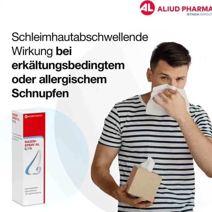 NASENSPRAY AL 0,1% Xylometazolinhydrochlorid 1,0 mg/ml Lösung Zur Anwendung bei Kindern ab 6 Jahren und Erwachsenen. Wirkstoff: Xylometazolinhydrochlorid. Zur Abschwellung der Nasenschleimhaut bei Schnupfen, anfallsweise auftretendem Fließschnupfen (Rhinitis vasomotorica), allergischem Schnupfen (Rhinitis allergica). Zur Erleichterung des Sekretabflusses bei Entzündung der Nasennebenhöhlen sowie bei Katarrh des Tubenmittelohres in Verbindung mit Schnupfen. Hinweis: Enthält Benzalkoniumchlorid. Sollte nicht länger als 7 Tage angewendet werden, es sei denn auf ärztliche Anordnung. Zu Risiken und Nebenwirkungen lesen Sie die Packungsbeilage und fragen Sie Ihre Ärztin, Ihren Arzt oder in Ihrer Apotheke. ALIUD PHARMA GmbH, Postfach 1380, 89146 Laichingen Stand: März 2021