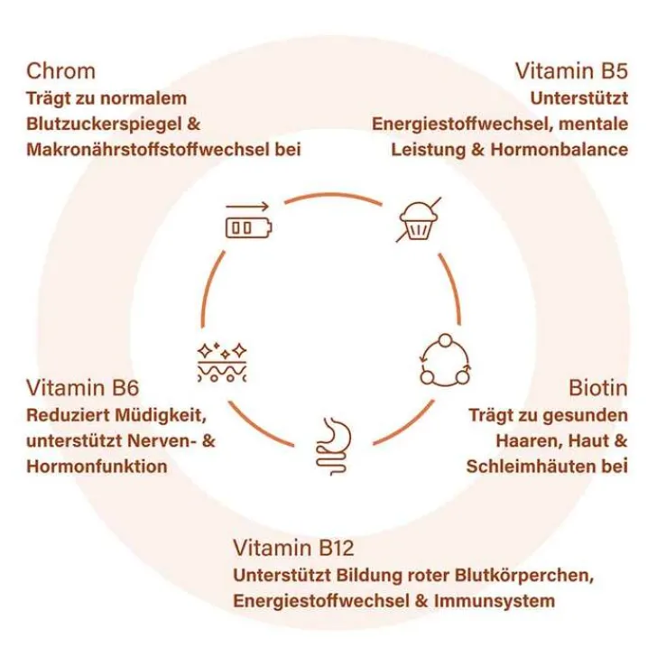 * Pantothensäure, Biotin, Vitamin B12 und Vitamin B6 tragen zu einem normalen Energiestoffwechsel bei. Pantothensäure trägt zu einer normalen Synthese und zu einem normalen Stoffwechsel von Steroidhormonen, Vitamin D und einigen Neurotransmittern bei. Pantothensäure, Folat, Vitamin B12 und Vitamin B6 tragen zur Verringerung von Müdigkeit und Ermüdung bei. Pantothensäure trägt zu einer normalen geistigen Leistung bei. Vitamin B6 trägt zu einer normalen Cystein-Synthese bei. Vitamin B6 , Vitamin B12 und Biotin tragen zu einer normalen Funktion des Nervensystems bei. Vitamin B6, Vitamin B12 und Folat tragen zu einem normalen Homocystein-Stoffwechsel bei. Vitamin B6 trägt zu einem normalen Eiweiß- und Glycogenstoffwechsel bei. Vitamin B6, Vitamin B12, Biotin und Folat tragen zur normalen psychischen Funktion bei. Vitamin B6 und Vitamin B12 tragen zur normalen Bildung roter Blutkörperchen bei. Vitamin B6, Vitamin B12 und Folat tragen zu einer normalen Funktion des Immunsystems bei. Vitamin B6 trägt zur Regulierung der Hormontätigkeit bei. Folat trägt zu einer normalen Aminosäuresynthese bei. Folat trägt zu einer normalen Blutbildung bei. Folat und Vitamin B12 haben eine Funktion bei der Zellteilung. Biotin und Chrom tragen zu einem normalen Stoffwechsel von Makronährstoffen bei. Biotin trägt zur Erhaltung normaler Haare bei. Biotin trägt zur Erhaltung normaler Schleimhäute bei. Biotin trägt zur Erhaltung normaler Haut bei. Chrom trägt zur Aufrechterhaltung eines normalen Blutzuckerspiegels bei.