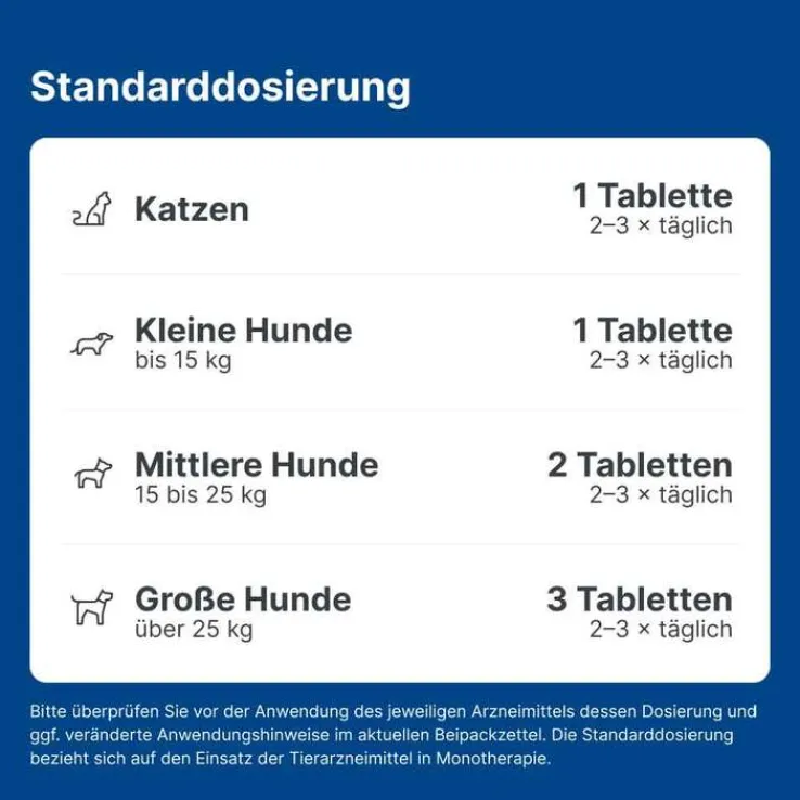 - Kleiner Hund/Katze (unter 15 kg): 2-3 mal täglich je 1 Tablette