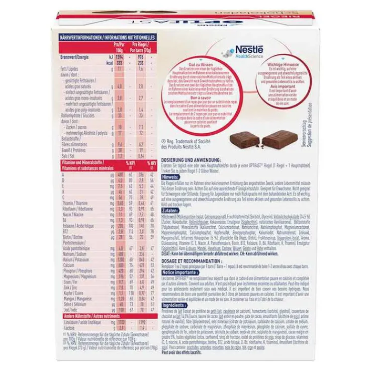 Die Optifast Riegel sind ein Mahlzeitersatz für eine gewichtskontrollierende Ernährung. Mit Zucker und Süßungsmittel.