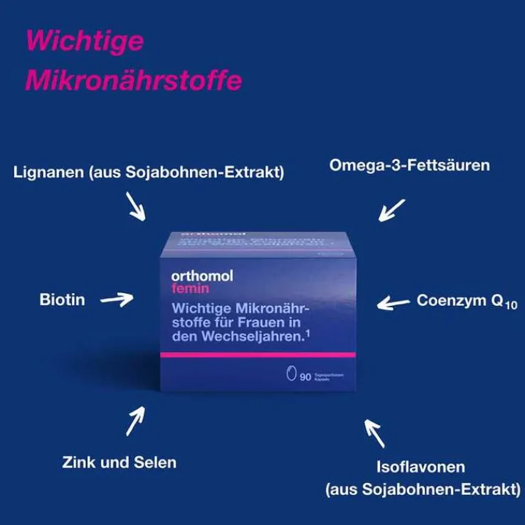 Orthomol Femin ist ein Nahrungsergänzungsmittel für Frauen in den Wechseljahren. Wichtige Nährstoffe für Haut, Haare und Nägel. Mit Biotin zum Erhalt normaler Haut und Haare sowie Selen zum Erhalt normaler Nägel. Mit Isoflavonen aus Soja und Lignanen aus Leinsamen, wichtigen Fettsäuren und Coenzym Q10.