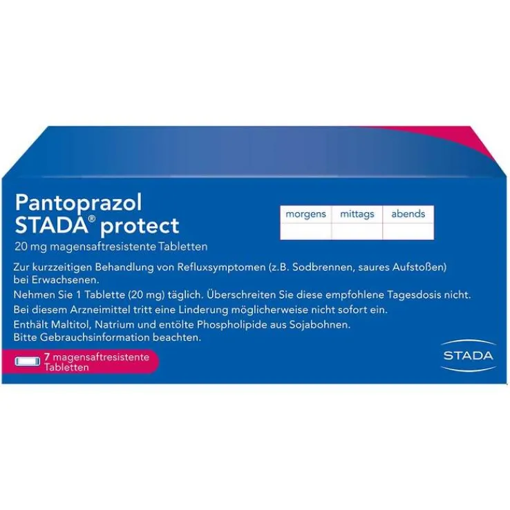 Pantoprazol STADA® protect 20 mg magensaftresistente Tabletten. Zur Anwendung bei Erwachsenen. Wirkstoff: Pantoprazol. Zur kurzzeitigen Behandlung von Reflux-Symptomen (z.B. Sodbrennen, saures Aufstoßen) bei Erwachsenen. Reflux ist der Rückfluss von Magensäure in die Speiseröhre, die sich schmerzhaft entzünden kann. Dies kann Symptome verursachen wie ein schmerzhaftes, zur Kehle aufsteigendes Brennen im Brustbereich (Sodbrennen) sowie einen sauren Geschmack im Mund (Säurerückfluss). Hinweis: Enthält Maltitol und entölte Phospholipide aus Sojabohnen. Zu Risiken und Nebenwirkungen lesen Sie die Packungsbeilage und fragen Sie Ihre Ärztin, Ihren Arzt oder in Ihrer Apotheke. STADA Consumer Health Deutschland GmbH, Stadastraße 2–18, 61118 Bad Vilbel, Stand: Juli 2020