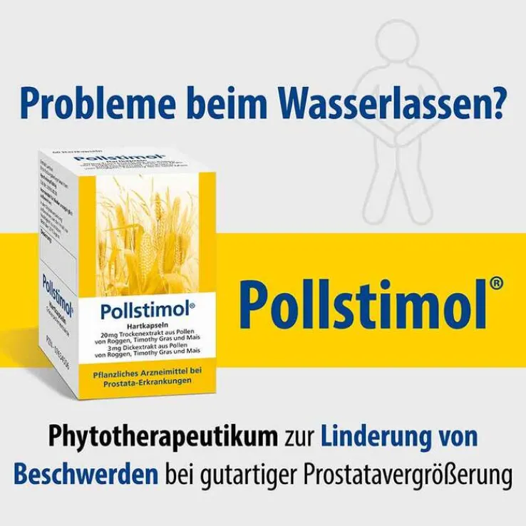 Pollstimol®. Hartkapseln. Wirkstoffe: 20 mg Trockenextrakt aus Pollen von Roggen, Timothy Gras, Mais, 3 mg Dickextrakt aus Pollen von Roggen, Timothy Gras, Mais. Anwendungsgebiete: Miktionsbeschwerden bei einer gutartigen Prostatavergrößerung (BPH) Stadium I bis II nach Alken bzw. II bis III nach Vahlensieck. Chronische abakterielle Prostatitis. Warnhinweis: enthält Lactose. Packungsbeilage beachten. 05.2021. Zu Risiken und Nebenwirkungen lesen Sie die Packungsbeilage und fragen Sie Ihre Ärztin, Ihren Arzt oder in Ihrer Apotheke.