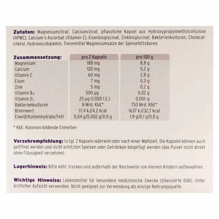Magnesiumcitrat. Calciumcitrat, pflanzliche Kapsel aus Hydroxypropylmethylcellulose (HPMC), Calcium-L-Ascorbat (Vitamin C), Eisenbisglycinat, Zinkbisglycinat. Bakterienkulturen*, Cholecalciferol, Hydroxocobalamin, Trennmittel Magnesiumsalze der Speisefettsäuren.
