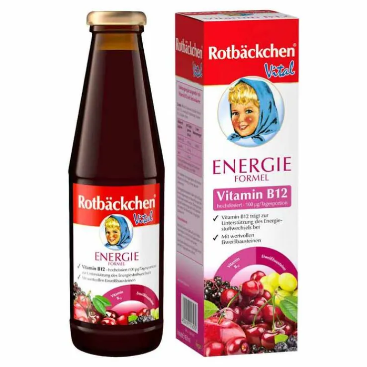Die Rotbäckchen Vital Energie Formel ist ein Nahrungsergänzungsmittel mit Vitamin B12 und Aminosäuren. Hergestellt wird der Saft aus sorgfältig ausgewählten weißen Trauben, Äpfeln, Kirschen, Aroniabeeren und Holunder, ergänzt um hochdosiertes Vitamin B12 und die Eiweißbausteine Serin und Glutamin.