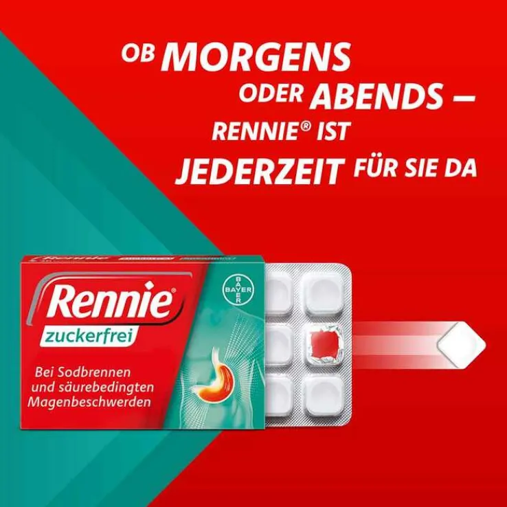 Rennie® zuckerfrei, Wirkstoffe: Calciumcarbonat/ schweres, basisches Magnesiumcarbonat. Zur symptomatischen Behandlung von Erkrankungen, bei denen die Magensäure gebunden werden soll, wie z. B.: Sodbrennen und säurebedingte Magenbeschwerden; Magen- und Zwölffingerdarmgeschwüre (Ulcus ventriculi oder Ulcus duodeni). Warnhinweis: Rennie® zuckerfrei enthält Isomalt. Stand: 3/2025. Bayer Vital GmbH, 51368 Leverkusen, Deutschland. Zu Risiken und Nebenwirkungen lesen Sie die Packungsbeilage und fragen Sie Ihre Ärztin, Ihren Arzt oder in Ihrer Apotheke.