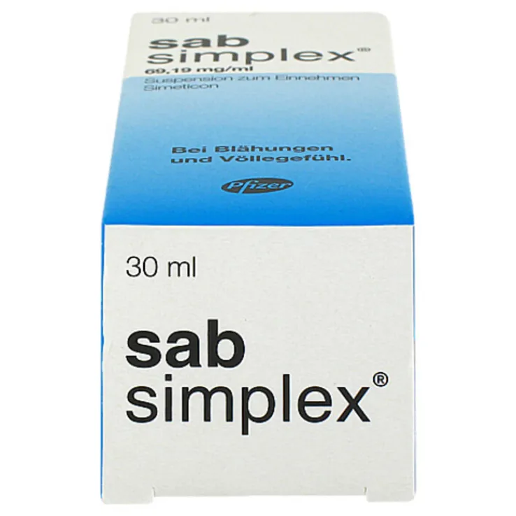 sab simplex®, 69,19 mg/ml Suspension zum Einnehmen. Wirkstoff: Simeticon (Dimeticon 350 – Siliciumdioxid im Verhältnis 92,5 : 7,5). Anwendungsgebiete: Zur symptomatischen Behandlung gasbedingter Magen-Darm-Beschwerden, z. B. Meteorismus. Als Hilfsmittel zur Diagnostik im Bauchbereich, wie z. B. Röntgen und Sonographie und zur Vorbereitung von Gastroduodenoskopien. Bei verstärkter Gasbildung nach Operationen. Bei Spülmittelvergiftungen. Warnhinweis: Enthält Natrium, Natriumbenzoat (E 211) und Alkohol (Ethanol im Himbeeraroma). Abgabestatus: Apothekenpflichtig. Stand: Mai 2021. Zu Risiken und Nebenwirkungen lesen Sie die Packungsbeilage und fragen Sie Ihre Ärztin, Ihren Arzt oder in Ihrer Apotheke. PFIZER PHARMA GmbH, Linkstr. 10, 10785 Berlin. b-1v12sab-su-0