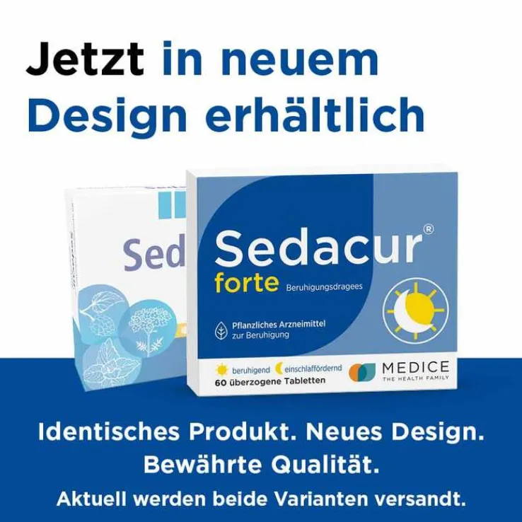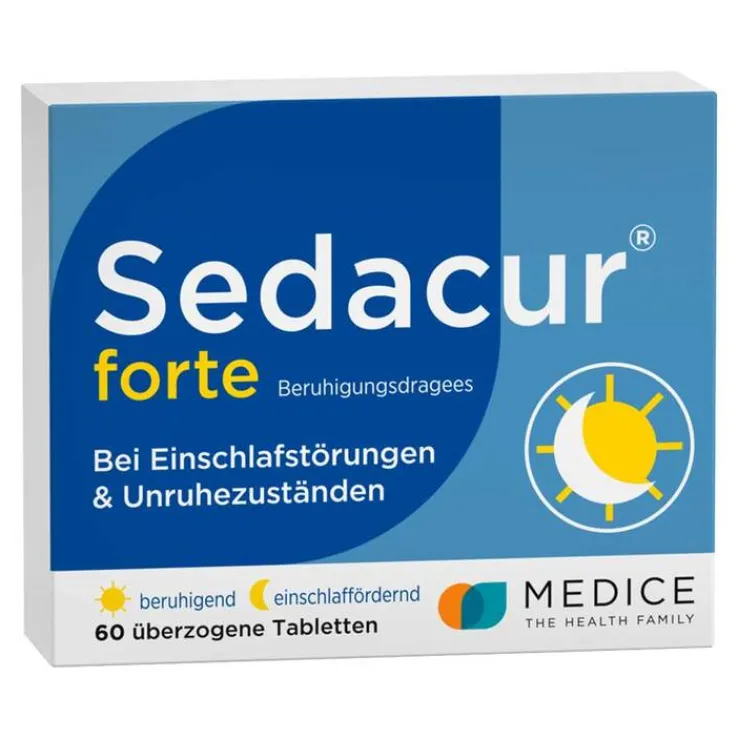 Sedacur® forte Beruhigungsdragees, Anwendungsgebiet: Unruhezustände und nervös bedingte Einschlafstörungen. Warnhinweis: enthält u. a. Glucose und Sucrose (Zucker). Falls die Beschwerden länger als 2 Wochen andauern oder sich verschlimmern, muss auf jeden Fall ein Arzt aufgesucht werden. Packungsbeilage beachten! Zu Risiken und Nebenwirkungen lesen Sie die Packungsbeilage und fragen Sie Ihre Ärztin, Ihren Arzt oder in Ihrer Apotheke. Stand: 11/2023. Schaper & Brümmer GmbH & Co. KG, Bahnhofstr. 35, 38259 Salzgitter