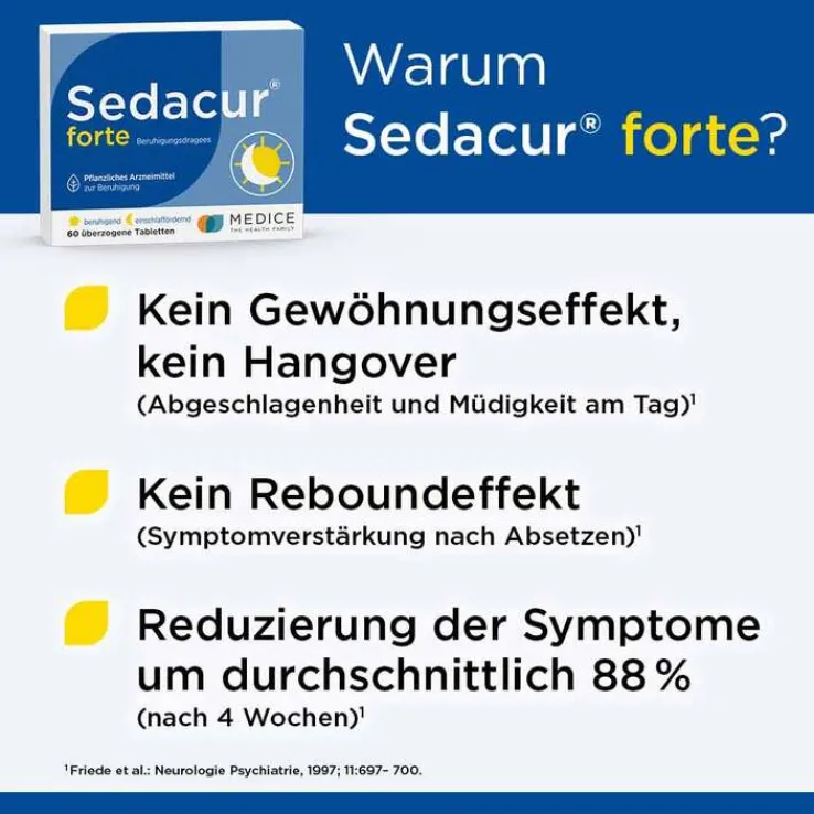 Mit Sedacur® forte Beruhigungsdragees ist es gelungen, ein modernes, wirksames und gut verträgliches Arzneimittel zur Behandlung von Unruhezuständen und nervös bedingten Einschlafstörungen zu entwickeln.