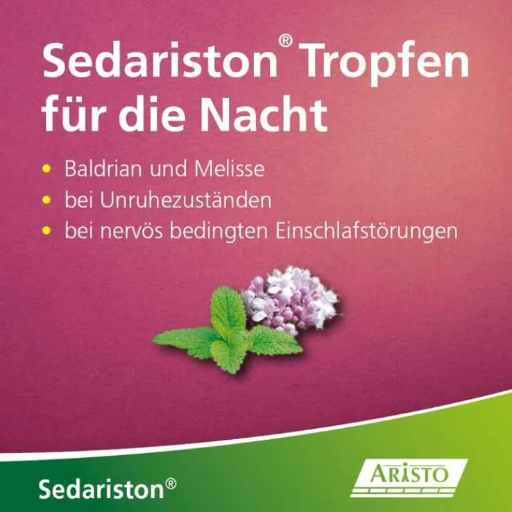 Sedariston® Tropfen für die Nacht Baldrian+Melisse. Wirkstoffe: Baldriantinktur, Melissenblätterfluidextrakt. Anw.: Bei Unruhezuständen und nervös bedingten Einschlafstörungen. Zu Risiken und Nebenwirkungen lesen Sie die Packungsbeilage und fragen Sie Ihre Ärztin, Ihren Arzt oder in Ihrer Apotheke. Enthält 65 Vol.-% Alkohol; Packungsbeilage beachten! Zu Risiken und Nebenwirkungen lesen Sie die Packungsbeilage und fragen Sie Ihre Ärztin, Ihren Arzt oder in Ihrer Apotheke. (Stand Sept. 2019) Aristo Pharma GmbH, Wallenroder Straße 8-10, 13435 Berlin.