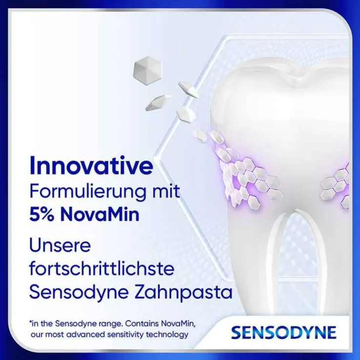 Sensodyne Clinical Repair Zahncreme mit 5 % NovaMin, beginnt empfindliche Zähne in 2 Minuten* zu reparieren. Die einzigartige NovaMin-Technologie bildet eine Schutzschicht über den empfindlichen Bereichen der Zähne, die zu 96 % aus dem gleichen Material wie natürlicher Zahnschmelz besteht. Diese Schutzschicht wird mit jeder Anwendung gestärkt.