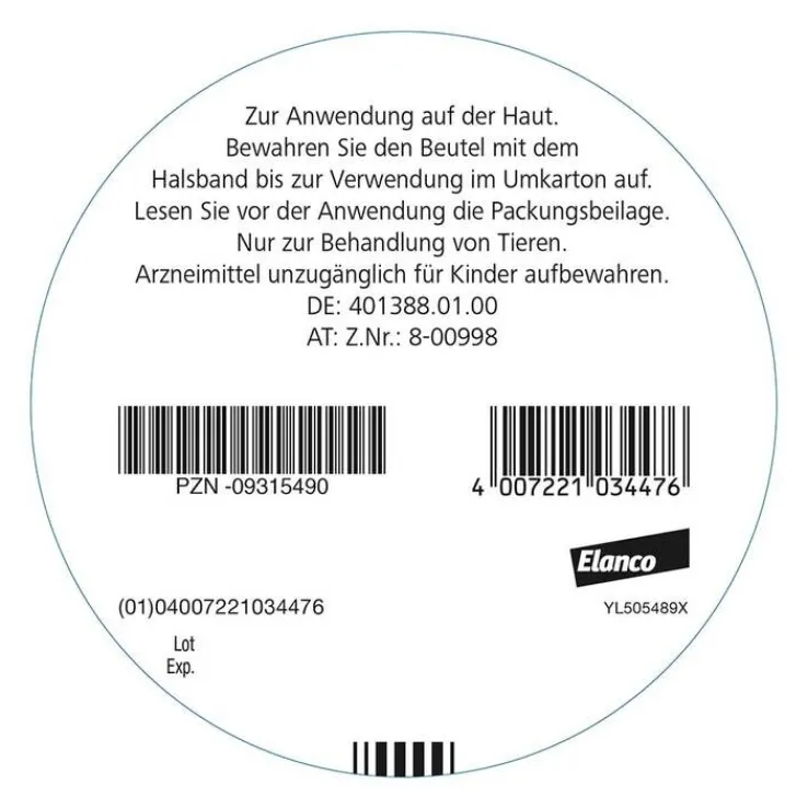 Seresto® 4,50 g + 2,03 g Halsband für Hunde > 8 kg. Anwendungsgebiete: Zur Vorbeugung und Behandlung von Flohbefall (Ctenocephalides felis, C. canis) mit einer Wirkungsdauer von 7 bis 8 Monaten. Das Tierarzneimittel verhindert die Entwicklung von Flohlarven in der unmittelbaren Umgebung des Tieres für 8 Monate. Das Tierarzneimittel kann als Teil der Behandlungsstrategie bei durch Flohstiche ausgelöster allergischer Hautentzündung (Flohallergiedermatitis, FAD) angewendet werden. Das Tierarzneimittel hat eine anhaltend akarizide (abtötende) Wirkung bei Zeckenbefall mit Ixodes ricinus, Rhipicephalus sanguineus, Dermacentor reticulatus, sowie repellierende (anti-feeding = die Blutmahlzeit verhindernde) Wirkung bei Zeckenbefall (Ixodes ricinus und Rhipicephalus sanguineus) mit einer Wirkungsdauer von 8 Monaten. Das Tierarzneimittel ist wirksam gegen Larven, Nymphen und adulte Zecken. Es ist möglich, dass Zecken, die zum Zeitpunkt der Behandlung bereits am Hund vorhanden sind, nicht innerhalb der ersten 48 Stunden nach Anlegen des Halsbandes getötet werden und angeheftet und sichtbar bleiben. Deshalb sollten die Zecken, die zum Behandlungszeitpunkt bereits auf dem Hund befindlich sind, entfernt werden. Der Schutz vor dem Befall mit neuen Zecken beginnt innerhalb von zwei Tagen nach Anlegen des Halsbandes. Das Tierarzneimittel vermittelt indirekten Schutz gegen eine Übertragung der Erreger Babesia canis vogeli und Ehrlichia canis durch die Vektorzecke Rhipicephalus sanguineus. Dadurch wird das Risiko für eine Babesiose und eine Ehrlichiose des Hundes über einen Zeitraum von sieben Monaten reduziert. Zur Verringerung des Infektionsrisikos durch den von Sandmücken übertragenen Erreger Leishmania infantum über einen Zeitraum bis zu 8 Monaten. Behandlung gegen Haarlingsbefall (Trichodectes canis). Zu Risiken und Nebenwirkungen lesen Sie die Packungsbeilage und fragen Sie Ihren Tierarzt oder Apotheker. Apothekenpflichtig. Pharmazeutischer Unternehmer: Elanco GmbH, Heinz-Lohmann-Straße 4, 27472 Cuxhaven, Deutschland Druckversion: 08/2020