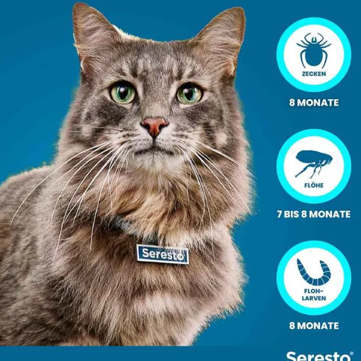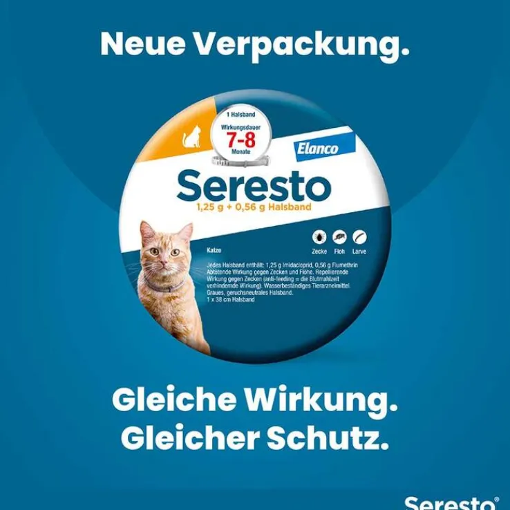 Seresto® 1,25 g + 0,56 g Halsband für Katzen. Anwendungsgebiete: Zur Behandlung und Vorbeugung eines Flohbefalls (Ctenocephalides felis) mit einer Wirkungsdauer von 7 bis 8 Monaten. Das Tierarzneimittel verhindert die Entwicklung von Flohlarven in der unmittelbaren Umgebung des Tieres für 10 Wochen. Das Tierarzneimittel kann als Teil der Behandlungsstrategie bei durch Flohstiche ausgelöster allergischer Hautentzündung (Flohallergiedermatitis, FAD) angewendet werden. Das Tierarzneimittel hat eine anhaltend akarizide (abtötende) Wirkung gegen Zeckenbefall mit Ixodes ricinus und Rhipicephalus turanicus und repellierende (anti-feeding = die Blutmahlzeit verhindernde) Wirkung gegen Zeckenbefall mit Ixodes ricinus, mit einer Wirkungsdauer von 8 Monaten. Das Tierarzneimittel ist wirksam gegen Larven, Nymphen und adulte Zecken. Es ist möglich, dass Zecken, die zum Zeitpunkt der Behandlung bereits an der Katze vorhanden sind, nicht innerhalb der ersten 48 Stunden nach Anlegen des Halsbandes getötet werden und angeheftet und sichtbar bleiben. Deshalb sollten die Zecken, die zum Behandlungszeitpunkt bereits auf der Katze befindlich sind, entfernt werden. Der Schutz vor Befall mit neuen Zecken beginnt innerhalb von zwei Tagen nach Anlegen des Halsbandes. Zu Risiken und Nebenwirkungen lesen Sie die Packungsbeilage und fragen Sie Ihren Tierarzt oder Apotheker. Apothekenpflichtig. Zulassungsinhaber: Elanco GmbH, Heinz-Lohmann-Straße 4, 27472 Cuxhaven, Deutschland Druckversion: 03/2021