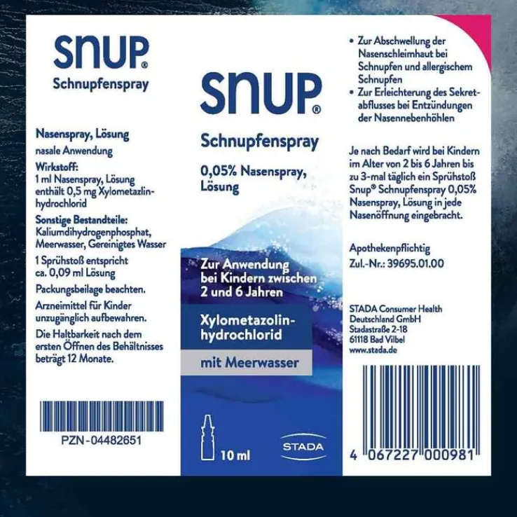SNUP® Schnupfenspray 0,05 % Nasenspray Zur Anwendung bei Kindern zwischen 2 und 6 Jahren Wirkstoff: Xylometazolinhydrochlorid. Zur Abschwellung der Nasenschleimhaut bei Schnupfen, anfallsweise auftretendem Fließschnupfen (Rhinitis vasomotorica), allergischem Schnupfen (Rhinitis allergica). Zur Erleichterung des Sekretabflusses bei Entzündung der Nasennebenhöhlen sowie bei Katarrh des Tubenmittelohrs in Verbindung mit Schnupfen. Zu Risiken und Nebenwirkungen lesen Sie die Packungsbeilage und fragen Sie Ihre Ärztin, Ihren Arzt oder in Ihrer Apotheke. STADA Consumer Health Deutschland GmbH, Stadastraße 2–18, 61118 Bad Vilbel Stand: März 2021
