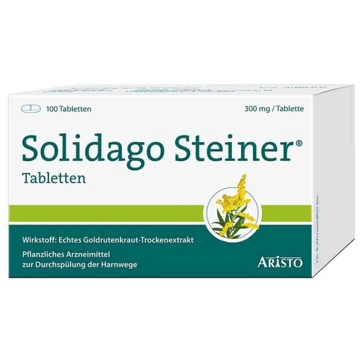 Solidago Steiner® Tabletten (Apothekenpflichtig), Wirkstoff: Echtes Goldrutenkraut-Trockenextrakt,Für Kdr. ab 12 J. und Erwachs.: Zur Durchspülung bei entzündlichen Erkrankungen der ableitenden Harnwege, Harnsteinen und Nierengrieß, zur Prophylaxe bei Harnsteinen und Nierengrieß. Zu Risiken und Nebenwirkungen lesen Sie die Packungsbeilage und fragen Sie Ihre Ärztin, Ihren Arzt oder in Ihrer Apotheke. (Stand Juni 2013). Aristo Pharma GmbH, Wallenroder Straße 8-10, 13435 Berlin.