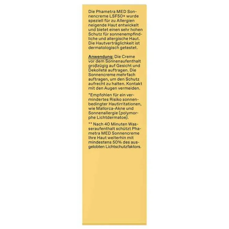 Die Phametra Med Sonnencreme LSF 50 + ist wasserfest: Nach 40 Minuten Wasseraufenthalt schützt die Sonnencreme LSF 50+ Ihre Haut weiterhin mit mindestens 50% des ausgelobten Lichtschutzfaktors.