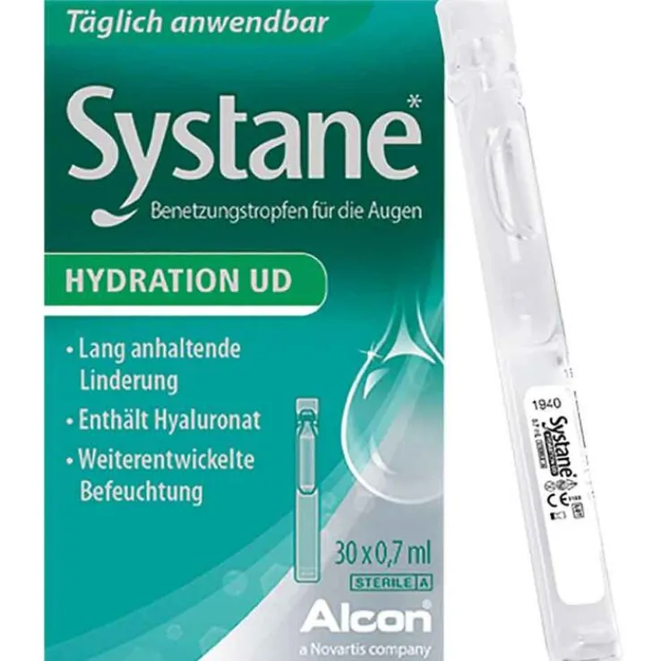 Wenn die Augen zu wenig Tränenflüssigkeit produzieren, deren Zusammensetzung nicht intakt ist oder wenn die Augenoberfläche irritiert ist, können als Folge trockene Augen entstehen. Ist der Tränenfilm dauerhaft gestört, entsteht zu viel Reibung an der Augenoberfläche und es kommt zu Bindehautrötungen und Augenentzündungen. Auch Kontaktlinsen werden dann zunehmend schlecht vertragen. Eine langanhaltende Linderung der Symptome trockener Augen bieten Systane® HYDRATION UD Benetzungstropfen für die Augen. Insbesondere für trockene Augen mit erhöhtem Feuchtigkeitsbedarf sind die Augentropfen gut geeignet. Dank der einzigartigen Kombination aus HP-Guar + Hyaluronsäure lindern sie die Symptome langanhaltend und unterstützen die Regeneration beschädigter Zellen.1 Systane® HYDRATION UD Benetzungstropfen sind kontaktlinsenverträglich und können daher auch während des Tragens von Kontaktlinsen angewendet werden. Dank der praktischen Einzeldosen enthalten Systane® HYDRATION UD Benetzungstropfen keine Konservierungsmittel.