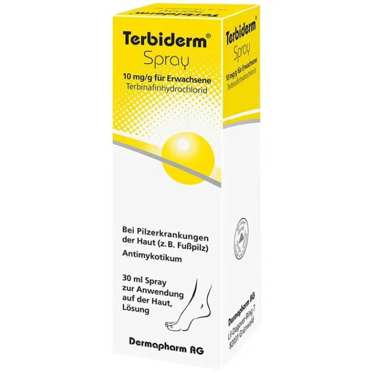 Terbiderm® Spray Wirkstoff: Terbinafinhydrochlorid. Anwendungsgebiete: Zur Behandlung von Dermatomykosen durch Terbinafin-empfindliche Pilze wie Dermatophyten und Hefen; insbesondere in Hautfalten zur Vermeidung von Feuchtigkeitsstau und Mazeration. Warnhinweise: enthält Propylenglycol. Nicht im Gesicht anwenden. Stand: 09/2020. Zu Risiken und Nebenwirkungen lesen Sie die Packungsbeilage und fragen Sie Ihre Ärztin, Ihren Arzt oder in Ihrer Apotheke.