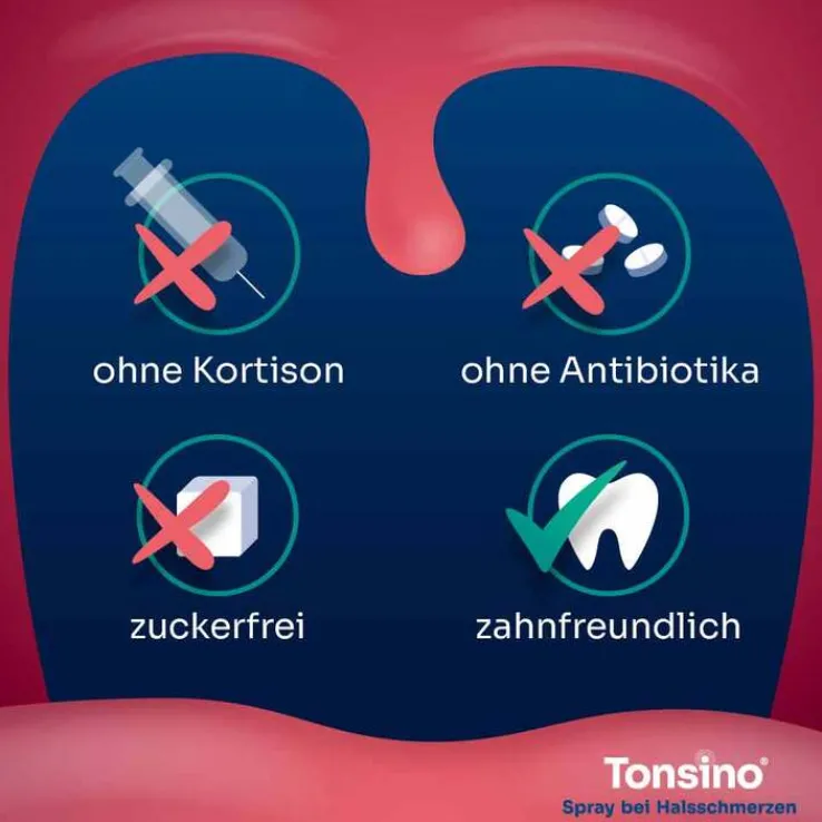 Das Tonsino® Halsspray wird unter Wahrung höchster deutscher Qualitätsstandards ohne Zucker hergestellt, enthält kein Kortison und ist kein Antibiotikum.