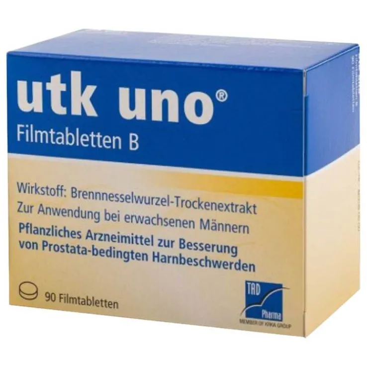 utk uno® Filmtabletten B. Wirkstoff: Trockenextrakt aus Brennesselwurzel. Anwendungsgebiete: utk uno® wird von Männern angewendet gegen Beschwerden beim Wasserlassen bei einer gutartigen Vergrößerung der Vorsteherdrüse (Prostata) im Stadium I bis II nach Alken bzw. II bis III nach Vahlensieck. Eine Behandlung mit utk uno® sollte nur nach ärztlicher Diagnose mit Ausschluss ernster Erkrankungen im Bereich der Harnwege erfolgen. Dieses Medikament behebt nicht die Vergrößerung der Prostata. Warnhinweis: Arzneimittel enthält Lactose. Präparat erst nach Rücksprache mit dem Arzt einnehmen, wenn eine Unverträglichkeit gegenüber bestimmten Zuckern vorliegt. Zu Risiken und Nebenwirkungen lesen Sie die Packungsbeilage und fragen Sie Ihre Ärztin, Ihren Arzt oder in Ihrer Apotheke. Stand: Mai 2012