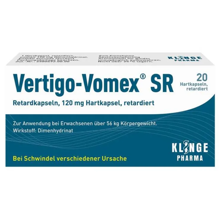 Vertigo-Vomex SR Retardkapseln, 120 mg Hartkapsel, retardiert: Wirkstoff: Dimenhydrinat. Anwendungsgebiet: Zur symptomatischen Behandlung von älteren Patienten mit Schwindel unterschiedlichen Ursprungs. Für Erwachsene über 56 kg Körpergewicht. Warnhinweise: Enthält Sucrose (Zucker). Arzneimittel f. Kinder unzugängl. aufbewahren. Stand: 07/21-2. Zu Risiken und Nebenwirkungen lesen Sie die Packungsbeilage und fragen Sie Ihre Ärztin, Ihren Arzt oder in Ihrer Apotheke. Klinge Pharma GmbH, 83607 Holzkirchen, Deutschland