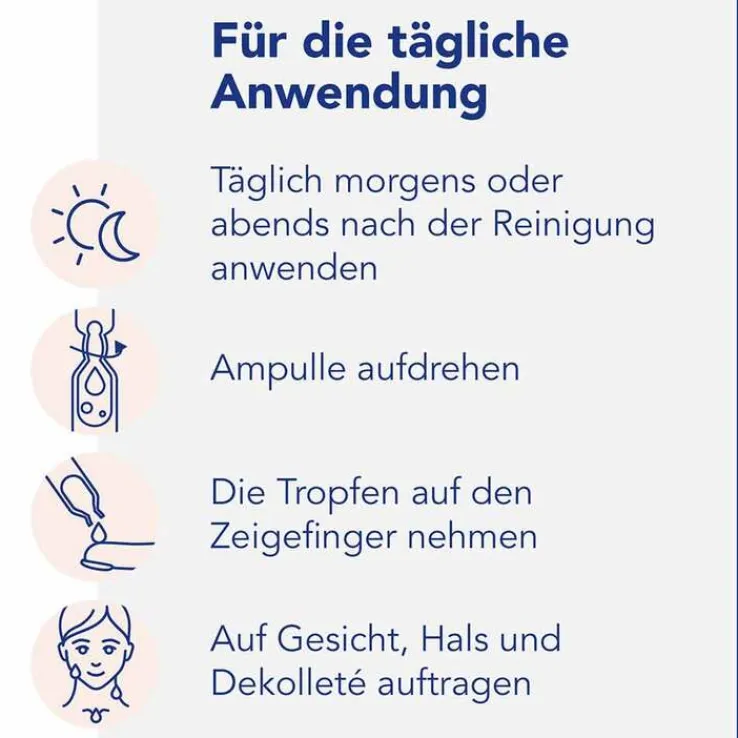 Einfach die Ampulle aufdrehen, die Tropfen mit dem Zeigefinger entnehmen und täglich morgens oder abends nach der Reinigung auf Gesicht, Hals und Dekollete auftragen.