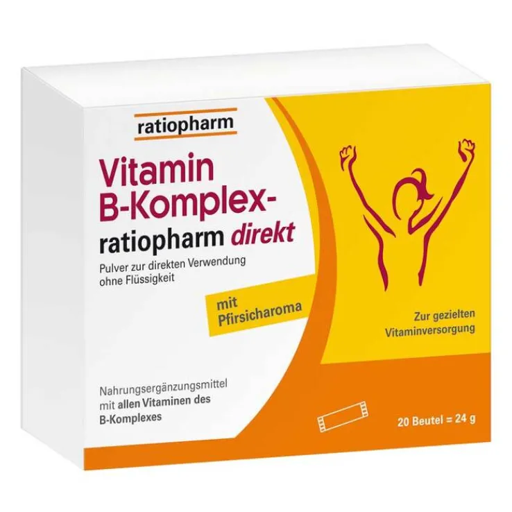 Von ratiopharm gibt es das erste Pulver mit allen acht B- Vitaminen: Vitamin B-Komplex-ratiopharm® direkt. Ein Beutel täglich reicht für die Versorgung mit allen acht B-Vitaminen aus – egal zu welcher Tageszeit und einfach ohne Wasser. Vitamin B-Komplex-ratiopharm® direkt schmeckt nach Pfirsich und ist frei von Laktose, Gluten, Zucker, Gelatine und sonstigen tierischen Inhaltsstoffen und ist somit auch für die vegetarische Ernährung geeignet.