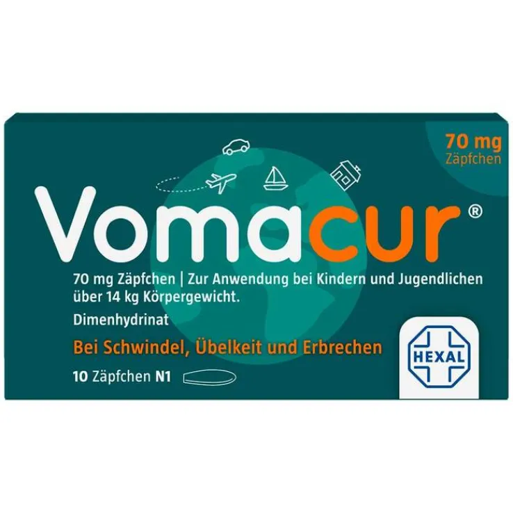 Vomacur® 70 mg Zäpfchen. Wirkstoff: Dimenhydrinat. Anwendungsgebiete: Zur Vorbeugung und Behandlung von Reisekrankheit, Schwindel, Übelkeit und Erbrechen. Zur Anwendung bei Kindern und Jugendlichen über 14 kg Körpergewicht. Hinweis: Dimenhydrinat ist zur alleinigen Behandlung von Übelkeit und Erbrechen im Gefolge einer medikamentösen Krebsbehandlung (Zytostatika-Therapie) nicht geeignet. Zu Risiken und Nebenwirkungen lesen Sie die Packungsbeilage und fragen Sie Ihre Ärztin, Ihren Arzt oder in Ihrer Apotheke. ! Mat.-Nr.: 2/51014506 Stand: Juni 2021. Hexal AG, 83607 Holzkirchen, www.hexal.de