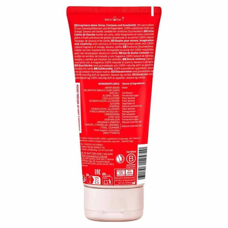 Inspirieren Sie Ihre Sinne, Fantasie und Kreativität. Die Weleda Inspire Shower Cream Granatapfel enthält kostbares Öl aus Granatapfelsamen und einen 100% natürlichen Duft von Orange, Davana, Vanille. Genießen Sie ein sinnliches Duscherlebnis.
