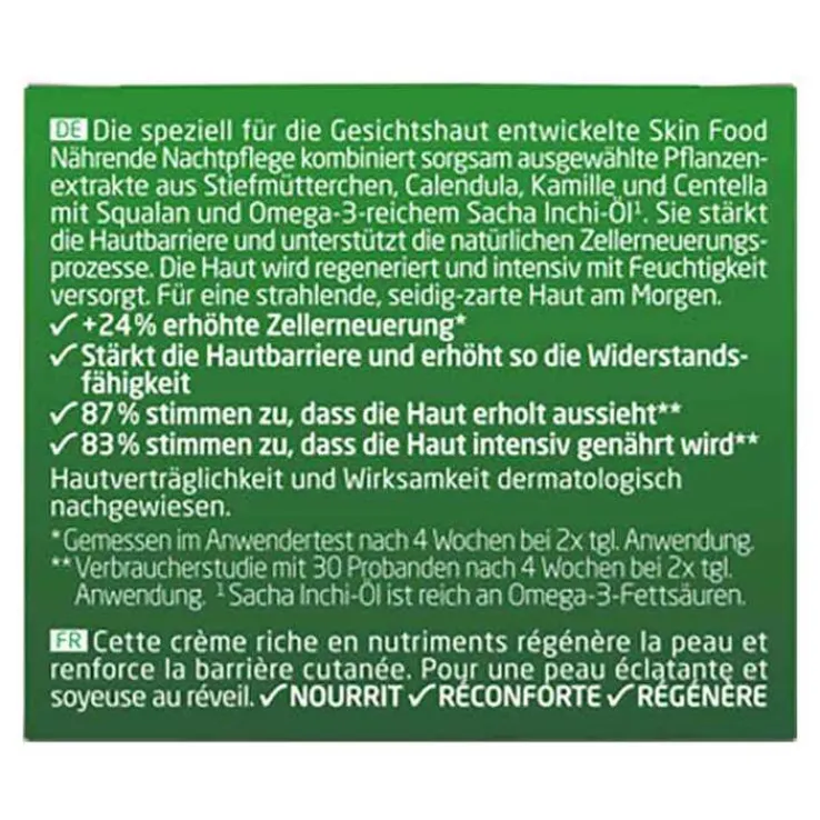 Die speziell für die Gesichtshaut entwickelte Skin Food Nährende Nachtpflege kombiniert sorgsam ausgewählte Pflanzenextrakte aus Stiefmütterchen, Calendula, Kamille und Centella mit Squalan und omega-3-reichem Sacha-Inchiöl. Sie stärkt die Hautbarriere und unterstützt die natürlichen Zellerneuerungsprozesse. Die Haut wird regeneriert und intensiv mit Feuchtigkeit versorgt. Für eine strahlende, seidig-zarte Haut am Morgen.